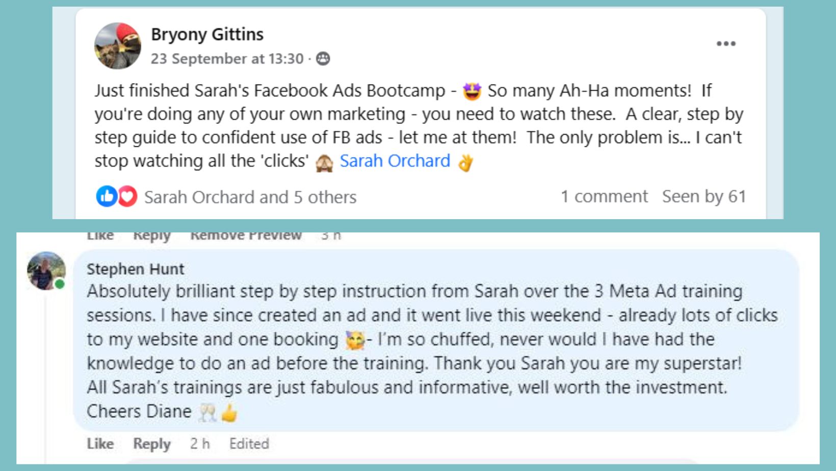 It doesn't matter what type of holiday or hospitality business you have - FB and Insta Ads can work for you without breaking the bank. You don't have to have a treehouse! I've filled holiday cottages, gastro pubs, yurts, horseboxes, gites, safari tents, and boutique hotels. It's based on what I have learnt from 30 years in marketing and getting results for hundreds of clients - no BS, no tricks.